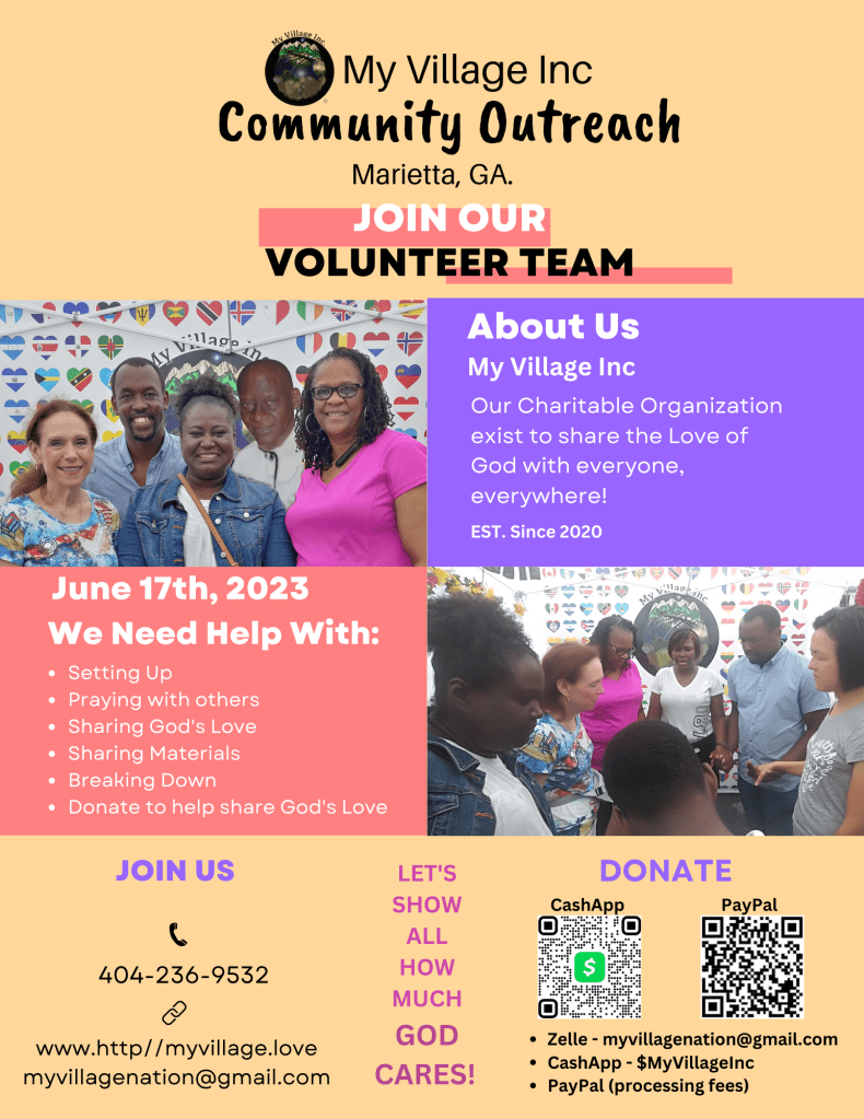 Roads lead to Marietta where My Village Inc partook in a Community Event. We were there to meet & greet persons from the community and share the message of our organization – Sharing the Love of God to everyone, everywhere! There was Prayer, Giveaways, The Word of the Day wheel, and much more. We also had a Raffle for 3 exciting prizes; winners will be contacted for their winnings. We sincerely thank all our volunteers for coming out to support and to minister; continue to lift up prayers and connect with us. Stay tuned for our next event(s).
