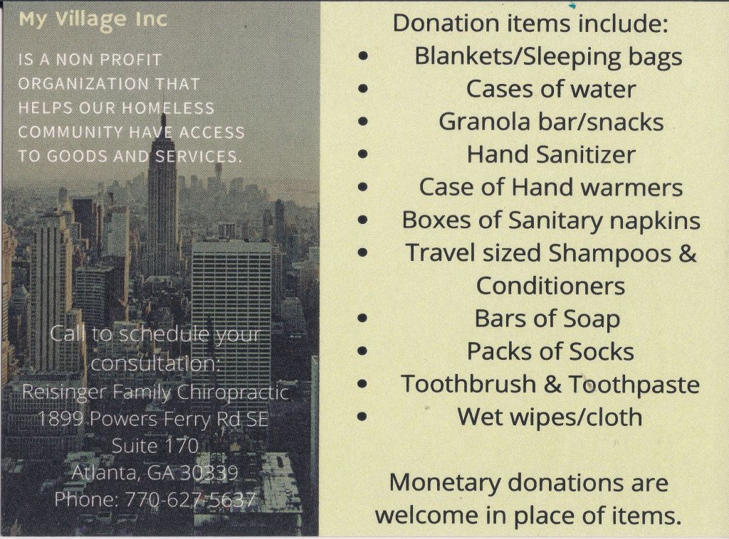 Claim a FREE Chiropractic Consultation when you donate items to this event; just show the about images along with your donation(s). Please bring donations by October 15th 2021 to the location and mention “My Village” or “Hallelujah in the City”.